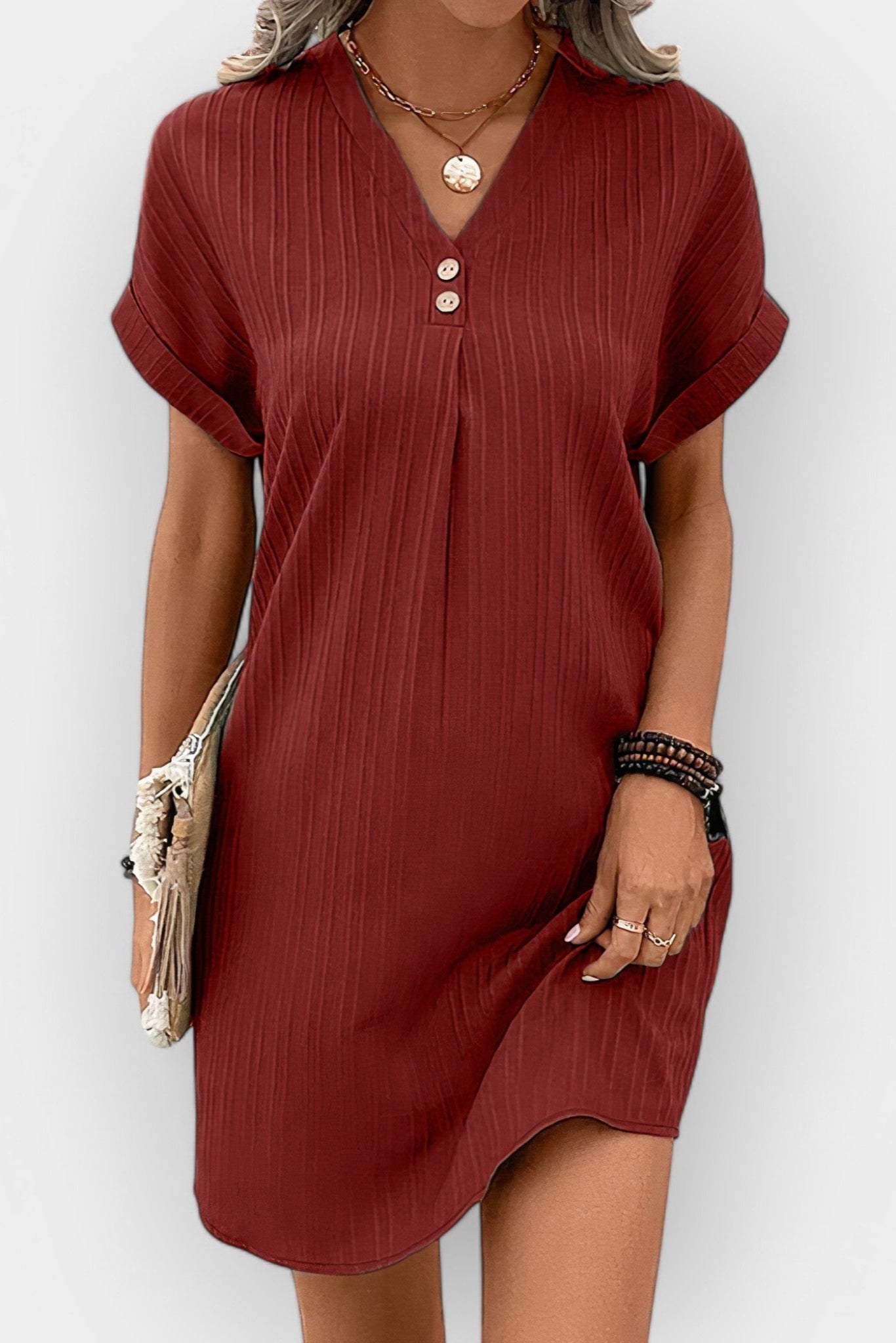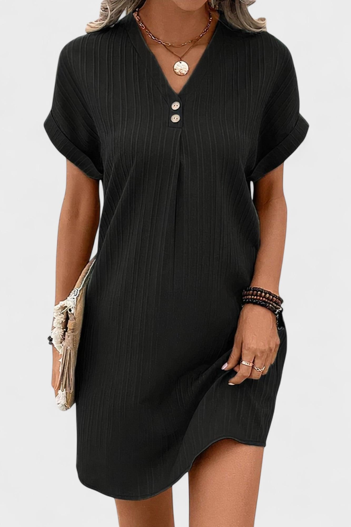 - Feminin V-hals og silhuet, der fremhæver dekoléten med elegant lethed.