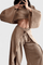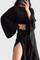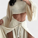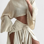 • Design og snit: Let kimono-top med bådudskæring og drapering, samt bindebukser med brede ben og sidesplits for bevægelse og elegance.