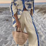 Camilla | Himmelstrand Sæt udstråler sofistikeret kystinspireret elegance og tidløst håndværk. Det cremefarvede stof, prydet af markante blå fuglemotiver og matchende sidepaneler, fremhæver sætets raffinerede detaljer og naturlige farvespil. Som et to-delt ensemble fortæller det en historie om håndværkets arv og langsom stil, der tiltaler dem, der værdsætter tidløst design. Med løs skjorte og brede bukser giver sætets åndbare konstruktion en behagelig silhuet til alt fra strandvandringer til aftener ved vandet. Begrænset tilgængelighed forstærker værdien og gør Camilla | Himmelstrand Sæt til et næsten samlerobjekt for dem, der ønsker en historie at gå i arv.