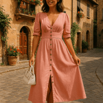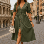 - Detaljer og æstetik: Frontknaplukning, puffede ærmer og rene linjer, der afspejler sofistikeret elegance og moderne lethed.