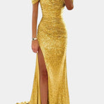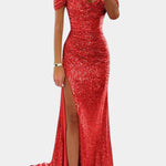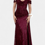 - Havfrue-snit og let train: Silhuetten fremhæver hofter og balancerer drapering med en let train for raffinement i bevægelse.