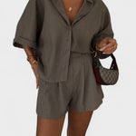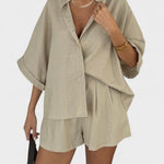 - Silhuet og design: Oversized skjorte med knapper og brede ærmer samt højtaljede linenbukser med elastisk talje og flatterende snit.