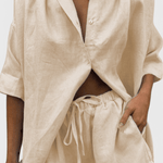 Anika | Sæt udstråler sommerlig, diskret luksus og den tidløse arv af håndværk. Sættet består af en knappet skjorte og lette shorts i en let bomuldsblanding, der sikrer åndbarhed, let vægt og behagelig temperaturstyring i varme måneder. Den strygefri finish gør vedligeholdelsen enkel, mens det justerbare snit sikrer komfort hele dagen. Det minimalistiske design tilpasser sig både lag-på-lag-stil og en ren sommerlook, og materialerne er nøje udvalgte for kvalitet og holdbarhed. Produceret i små partier for at bevare håndværksmæssig betydning og eksklusivitet, tilbyder Anika en tidsløs appel, som kan gå i arv og fuldende en kvalitetsorienteret garderobe.