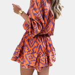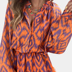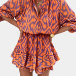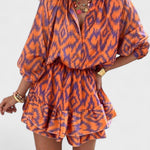Asta | Farverig heldragt er et statement i tidløs elegance og fint håndværk. Inspireret af Yasmine forener den kjolens lethed med heldragtens praktiske frihed, mens ikat-printet i nuancerne orange og lilla skaber levende kontraster og et ikonisk visuelt udtryk. Det detaljerede snit afspejler omhyggeligt udvalgte materialer og håndværk: lagdelte volanger ved nederkanten, en afslappet silhuet som giver let bevægelse, puffede ærmer og en knappelukket halsudskæring for en legende, komfortabel balance. Den elastiske talje former silhuetten uden at begrænse bevægelsesfriheden. Tilgængeligheden i et begrænset antal understreger eksklusivitet og giver Asta en tidløs samlerappel. Fuldendt håndværk og udvalgte materialer signalerer kvalitet, holdbarhed og lang levetid, hvilket gør den til et tidløst kendetegn i garderoben.