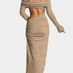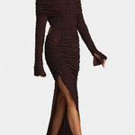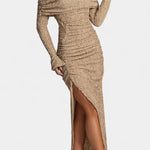 - Design og konturer: Strategiske snit fremhæver konturerne med diskret, sofistikeret elegance og passer til mange begivenheder. Rynket detalje og høj slids tilføjer struktur, bevægelse og en subtil, sensuel flair.