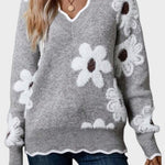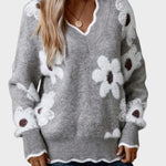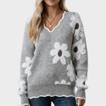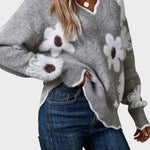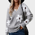 Thea | Blomstertrøje udstråler raffinement og varm feminin elegance. Hver detalje vidner om håndværkets omhu: det unikke blomsterprint og den elegante V-hals, der fremhæver halsen med diskret sofistikation. Den bløde, lette garnkvalitet krammer kroppen uden at virke tung og gør trøjen ideel til kølige dage og passer til både afslappede stunder og små formelle lejligheder. Med begrænset produktion fremstår Thea som en eksklusiv signatur i garderoben, hvis tidløse æstetik og holdbare konstruktion lover lang levetid og naturlig samlerappel. Den sofistikerede detalje og den nemme pleje understøtter en garderobe med værdifuld, langtidsholdbar elegance.