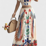 Thilde | Boho sæt udstråler let luksus og tidsløs stil gennem bohemisk formsprog og håndværksmæssig præcision. Itzel-inspirationen skaber en skulpturel kort top i smocket snit, harmonisk med en løs, flagrende nederdel, der bevæger sig i vinden. Etnisk mønster med påfugle og blomster i symmetrisk design og delikate fjæredetaljer giver sættet en kunstnerisk, moderne flair uden at gå på kompromis med subtiliteten. Omhyggeligt udvalgte materialer og små partier sikrer lang levetid og eksklusivitet, som passer til ferier og særlige arrangementer. Tilgængeligt i begrænset antal — en tidløs samlergenstand, der tilfører garderoben elegance og lang levetid. Håndværket står tydeligt i hver søm og hvert mønster og giver en følelse af arv.